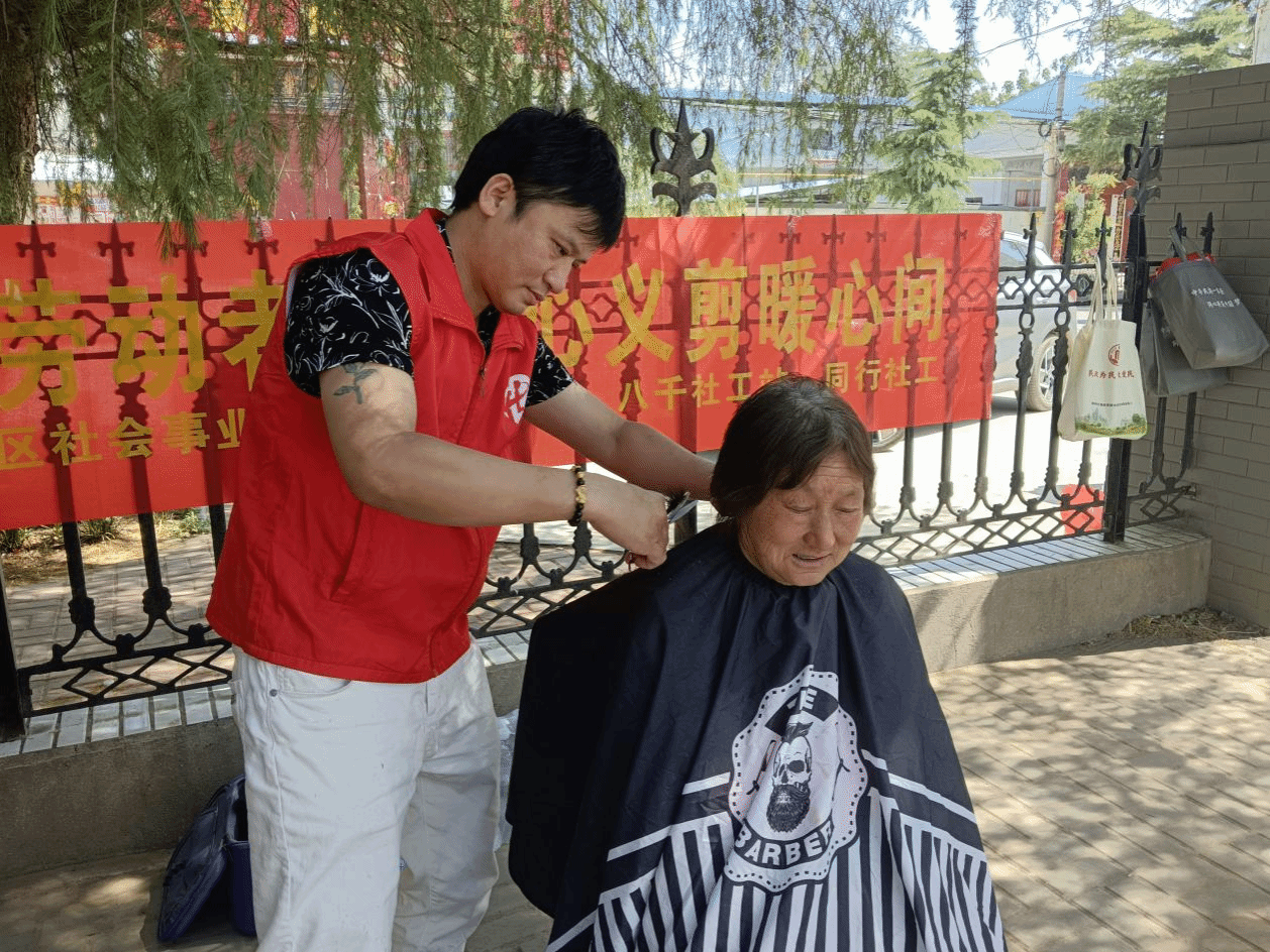 活动现场,身着统一红色志愿服的大学生们格外醒目。他们与社区人员密切配合,有序开展各项服务。物资发放区,志愿者将毛巾、小风扇、矿泉水等物资整齐发放给环卫工人与社区居民;“爱心发廊”内,理发师与志愿者为环卫工人和老年居民提供免费理发服务;文化宣传小组志愿者穿梭街道,向群众普及劳动法规、环保知识并答疑解惑。