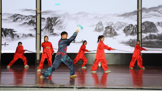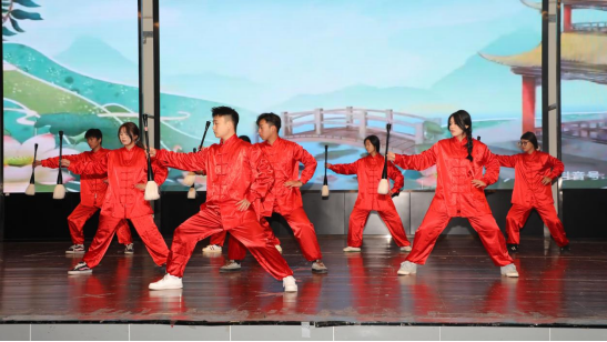 演出由七星拳、太极剑、八段锦、春秋大刀、武术单刀、太极精要十八式、功夫扇、棍术、太极毛笔等节目组成。太极拳作为中国传统武术的瑰宝,其动作流畅、刚柔并济,恰似流水般灵动不息。学生们身着传统服饰,脚踏轻盈步伐,一招一式都蕴含着对水的敬畏,充分体现了太极拳“上善若水”的意境,诠释了水文化中与自然和谐共生的智慧,展现了非物质文化遗产在新时代的勃勃生机。