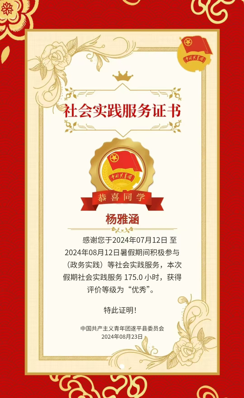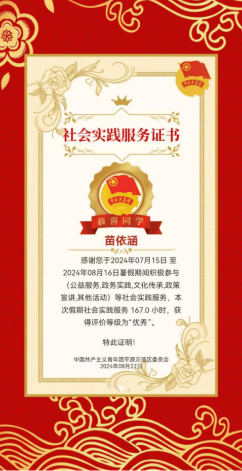 暑假期间,暑假期间,四位同学主动参加家乡社会公益服务,参与的社会实践项目包括多彩假期“艺”路“童”行、毛遂故里文化宣传、镇区文明劝导、学业帮扶、园林绿化、敬老院志愿服务等多项内容,累计服务时长分别达到167小时、216小时、175小时和146小时,不仅锤炼了意志品质,提升了社会服务能力,也为学校赢得了荣誉,用实际行动诠释了新时代大学生的责任与担当。希望水环学子以他们为榜样,积极投身社会实践,在担当中历练,在服务中成长。