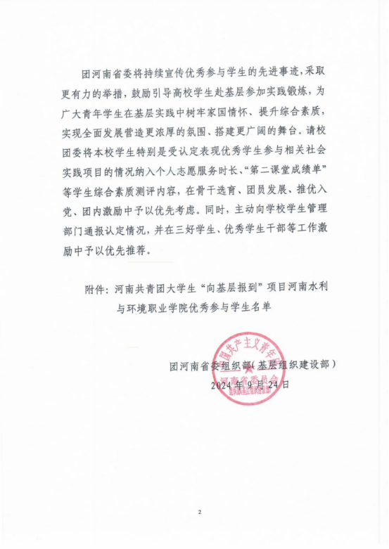 近日,ylzzcom永利总站线路检测2023级现代物流管理专业学生苗依涵、刘梦豪、2023级环境艺术设计专业学生杨雅涵、2023级水利水电建筑工程专业学生王梓翰在2024年度河南共青团大学生“向基层报到”项目活动中凭借卓越表现,荣获团省委颁发的“优秀参与学生”称号。