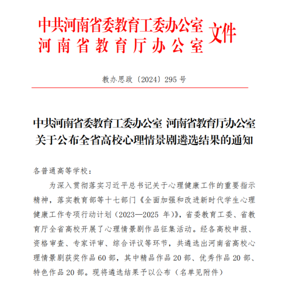 本次活动由河南省委教育工委、河南省教育厅主办,经各高校申报、资格审查、专家评审、综合评议等环节,共遴选出河南省高校心理情景剧作品60部,其中精品作品、优秀作品、特色作品各20部。ylzzcom永利总站线路检测高度重视、精心组织、广泛宣传,共征集到8件作品,作品题材多样、内容丰富。