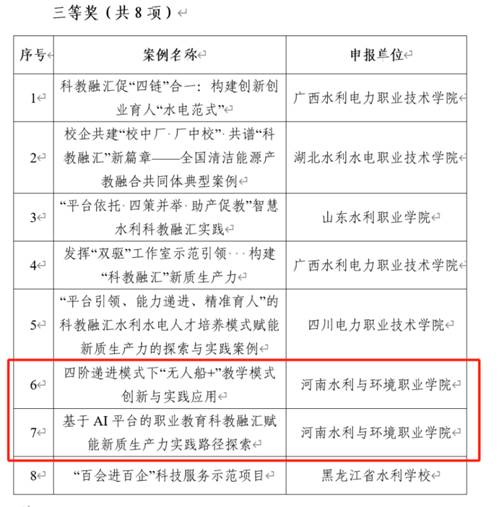 近日,中国水利教育协会公布了水利职业教育“科教融汇”典型案例遴选结果,ylzzcom永利总站线路检测报送的《四阶递进模式下“无人船+”教学模式创新与实践应用》和《基于AI平台的职业教育科教融汇赋能新质生产力实践路径探索》两个案例荣获三等奖。