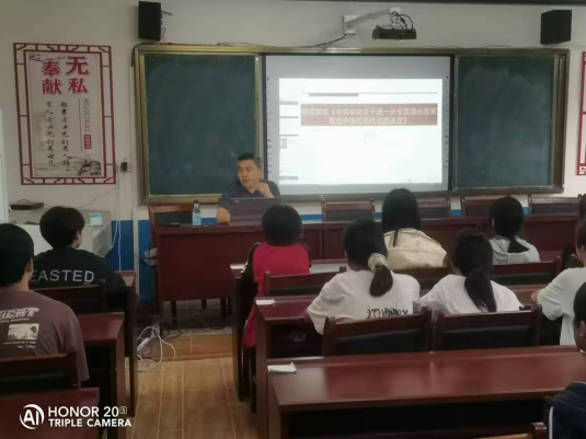 送政策。马克思主义学院教师苗永振在东和店镇第一初级中学和平舆县新时代文明实践中心,以“深度解读《中共中央关于进一步全面深化改革、推进中国式现代化的决定》”为题,从为什么改、向哪里改、怎么改三个角度对党的二十届三中全会精神进行了宣讲。宣讲融理论性、思想性和实践性于一体,具有很强的启发性,听讲的学生和干部职工反映良好。