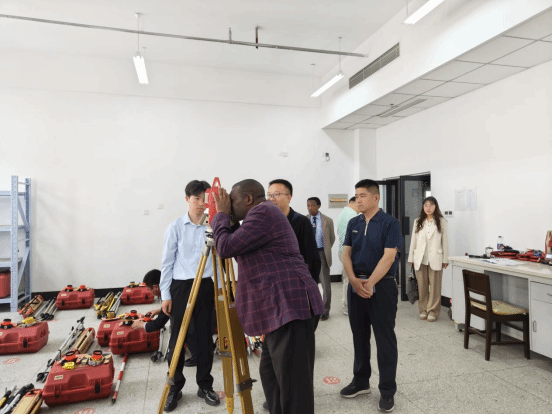 代表团实地考察了测绘地理信息虚拟仿真实训中心,深入无人机实习实训室、数字测图实训室、卫星导航实训室等核心教学平台。在虚拟仿真实训教学中心,代表团体验三维激光扫描建模系统与实景复制技术,通过沉浸式交互设备感受数字孪生技术在智慧城市建设中的应用;在工程测量实训区,实操多款国产高精度全站仪、电子水准仪及多模多频GNSS接收机等设备,对其技术突破与稳定性给予充分肯定;在无人机应用实训环节,完成无人机地面站操控、航线规划及应急返航等全流程演练。参观中,双方围绕设备参数、课程设置、产学研转化展开交流,代表团高度认可学院“虚实结合、软硬并重”的实践教学模式及优质育人环境。