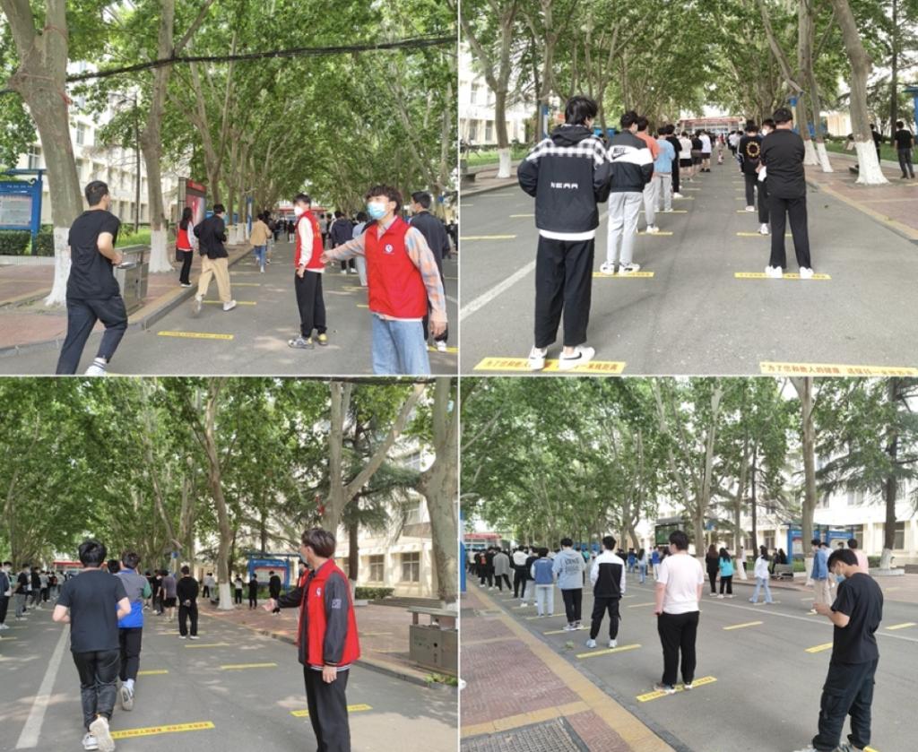 这是我和班长团支书反复核对参加核酸检测集合时的情形,确保不漏一人。因为学生都在宿舍上网课,所以全校核酸检测是以班级为单位轮流进行的。为了把握核酸检测的整体进度,我提前让班委和任课老师协调上课时间,召集学生迅速到指定地点集合、保持一米距离、参加核酸检测。