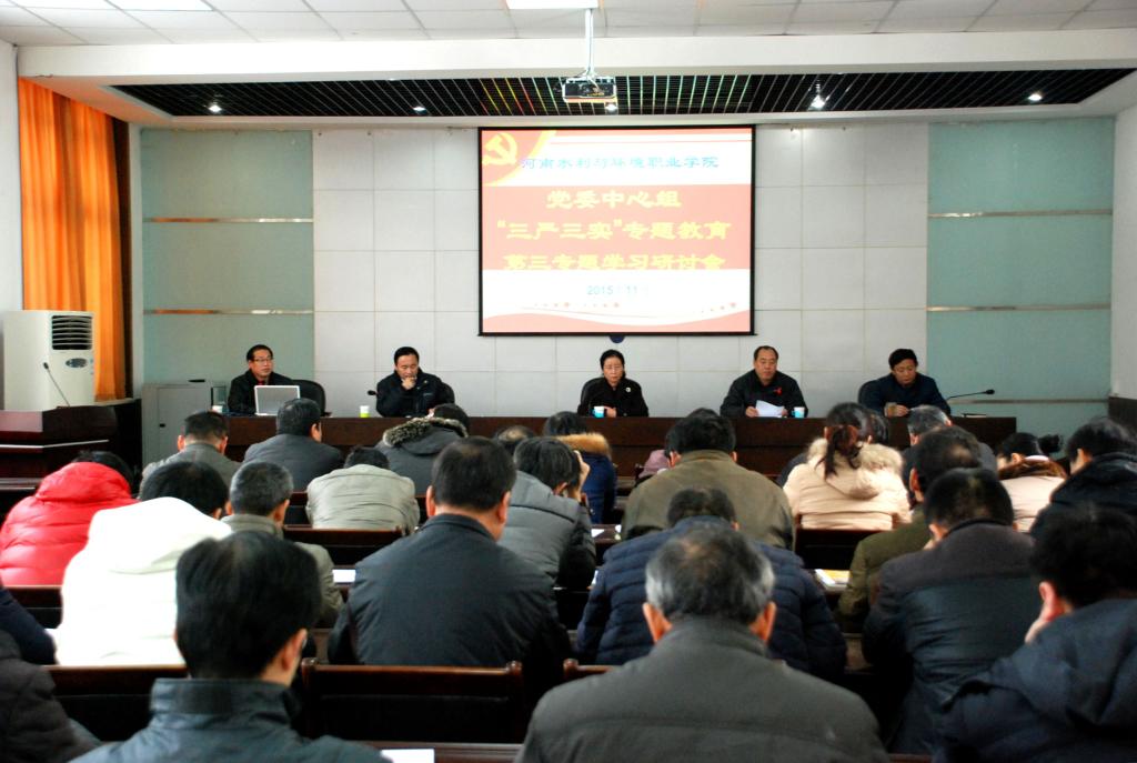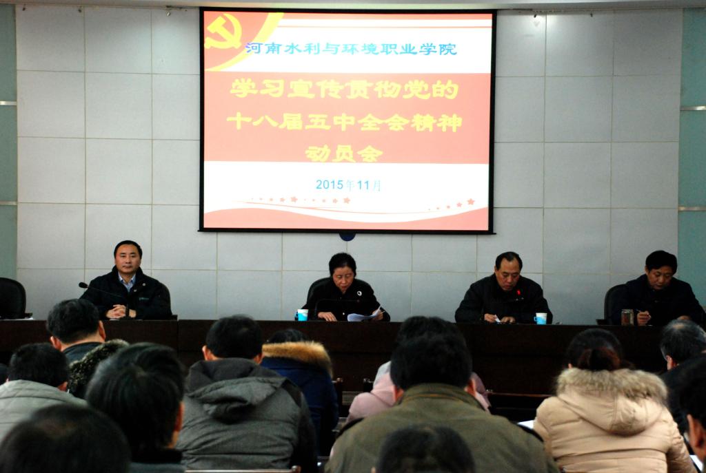 11月24日下午,院党委在图书馆学术报告厅组织召开了“三严三实”专题教育第三专题学习研讨暨学习宣传贯彻党的十八届五中全会精神动员会。院领导赵高潮、李连水、黄功学、蒋彦成及全体中层干部参加了会议。会议由党办主任霍国义主持。
