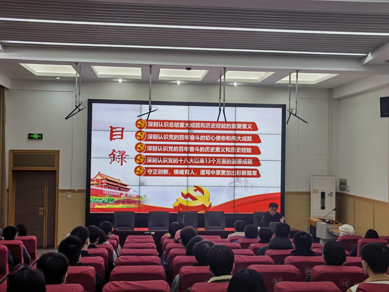 张凌杰围绕党的十九届六中全会审议通过的《中共中央关于党的百年奋斗重大成就和历史经验的决议》,运用翔实丰富的历史资料,深刻讲解了“总结重大成就和历史经验的重要意义”、“党的百年奋斗的初心使命和伟大成就”、“党的百年奋斗的历史意义和历史经验”、“党的十八大以来13个方面的重要成就”等重要内容。他强调,中国共产党百年奋斗的光辉历史彰显了中国共产党的伟大精神,具有重大的历史意义。新时代青年大学生务必要学好党史、铭记党史,用党的创新理论武装头脑、指导实践,继承和发扬以爱国主义为核心的民族精神和以改革创新为核心的时代精神,以昂扬向上的精神面貌积极投入到第二个百年奋斗目标的新征程中去。