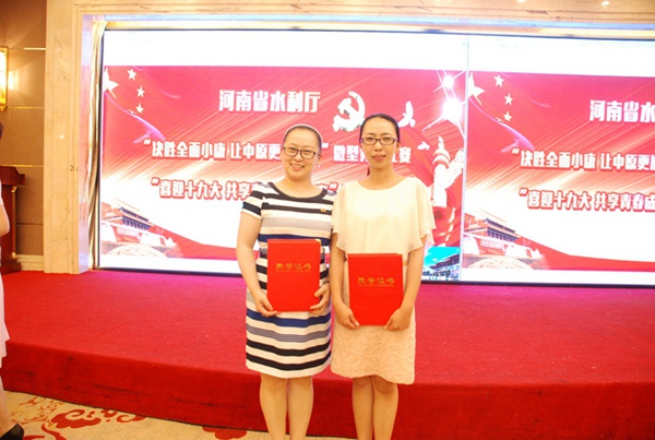 6月9日下午,全省水利系统“决胜全面小康让中原更加出彩”微型党课比赛在山河宾馆举行,省直工委和省水利厅机关党委有关领导莅临比赛现场,观看比赛并为获奖选手和组织工作先进单位颁发了荣誉证书,来自厅机关、厅属单位的29名选手参加了比赛,200余名党员干部观众观看了比赛。比赛实行百分制,由评委现场直接打分并公布成绩。我院郝思惠老师和邵琳老师借助精彩纷呈的多媒体课件,运用大量生动鲜活的事例,主题鲜明,富有创意,深入浅出、生动感人,展现了我院老师的素质和风采,赢得观众阵阵热烈的掌声。经过激烈角逐,郝思惠老师荣获个人三等奖,我院荣获优秀组织奖。