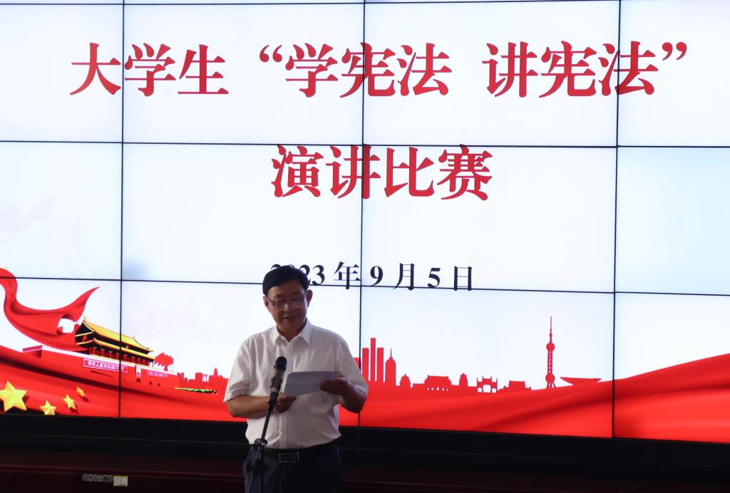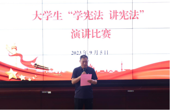 蒋彦成在致辞中表示,学校坚持举行“学宪法 讲宪法”演讲比赛,不仅是普及法律常识、展现青年学生良好法律素养、提升学生法律意识的重要举措,也是深入学习贯彻习近平法治思想,推动大学生宪法宣传教育常态化长效化,引导大学生自觉做宪法的忠实尊崇者、自觉遵守者、坚定捍卫者的长效之策。