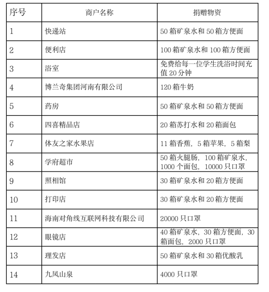 10月27日-31日,航空港校区共计14家商户向ylzzcom永利总站线路检测捐赠生活物资。