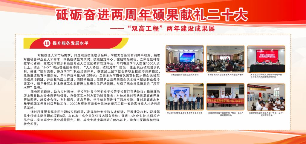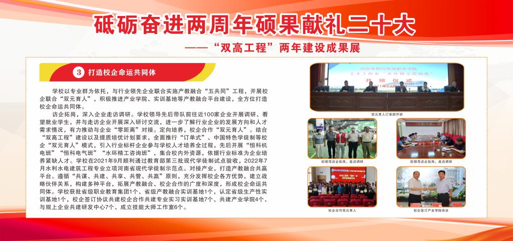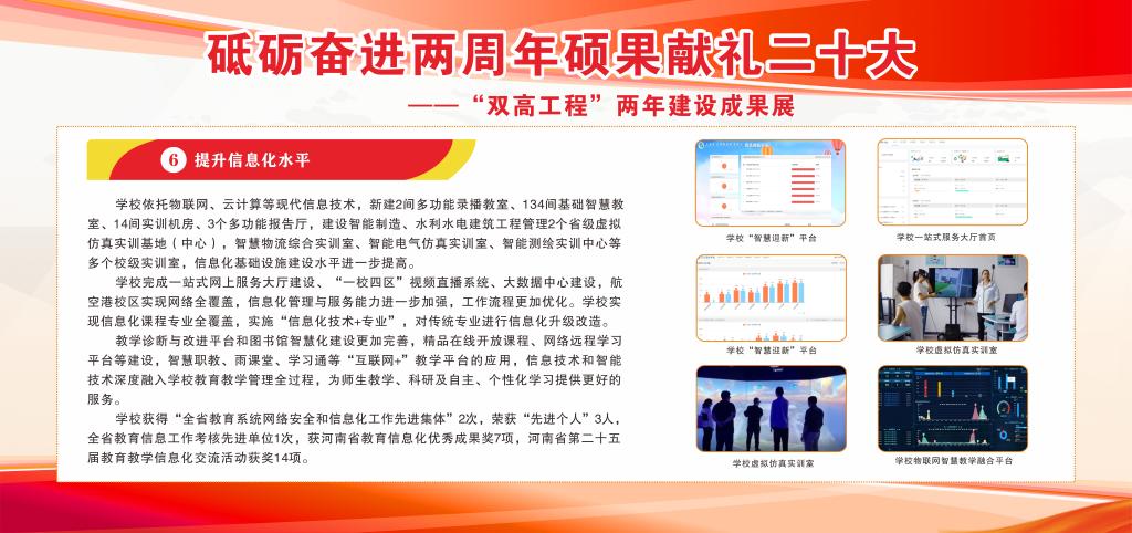 自2020年8月获批河南省高水平高职院校和高水平专业群立项建设以来,ylzzcom永利总站线路检测坚持以习近平新时代中国特色社会主义思想为指导,全面贯彻落实习近平总书记关于教育的重要论述,坚持党建为引领,聚焦“一落实、四打造、五提升”十项“双高工程”建设内容,有计划地推进各项任务落地见效,助推教育教学创新发展,在引领职业教育改革发展和人才培养、支撑国家战略和地方经济社会发展、形成一批有效支撑职业教育高质量发展的政策和制度方面做出了应有贡献。