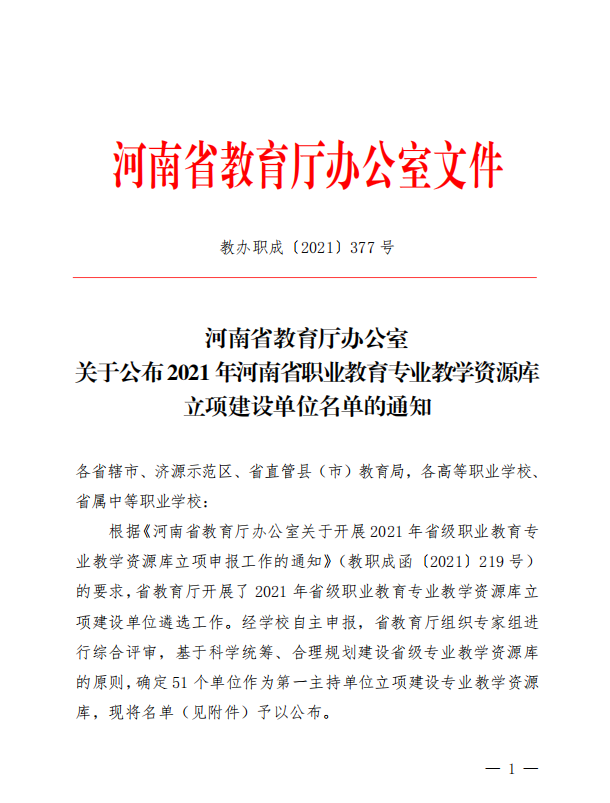 近日,河南省教育厅办公室印发《关于公布2021年河南省职业教育专业教学资源库立项建设名单的通知》(教办职成〔2021〕377号),ylzzcom永利总站线路检测主持的智能建造技术专业教学资源库和联合主持的装配式建筑工程技术专业教学资源库获批立项建设。