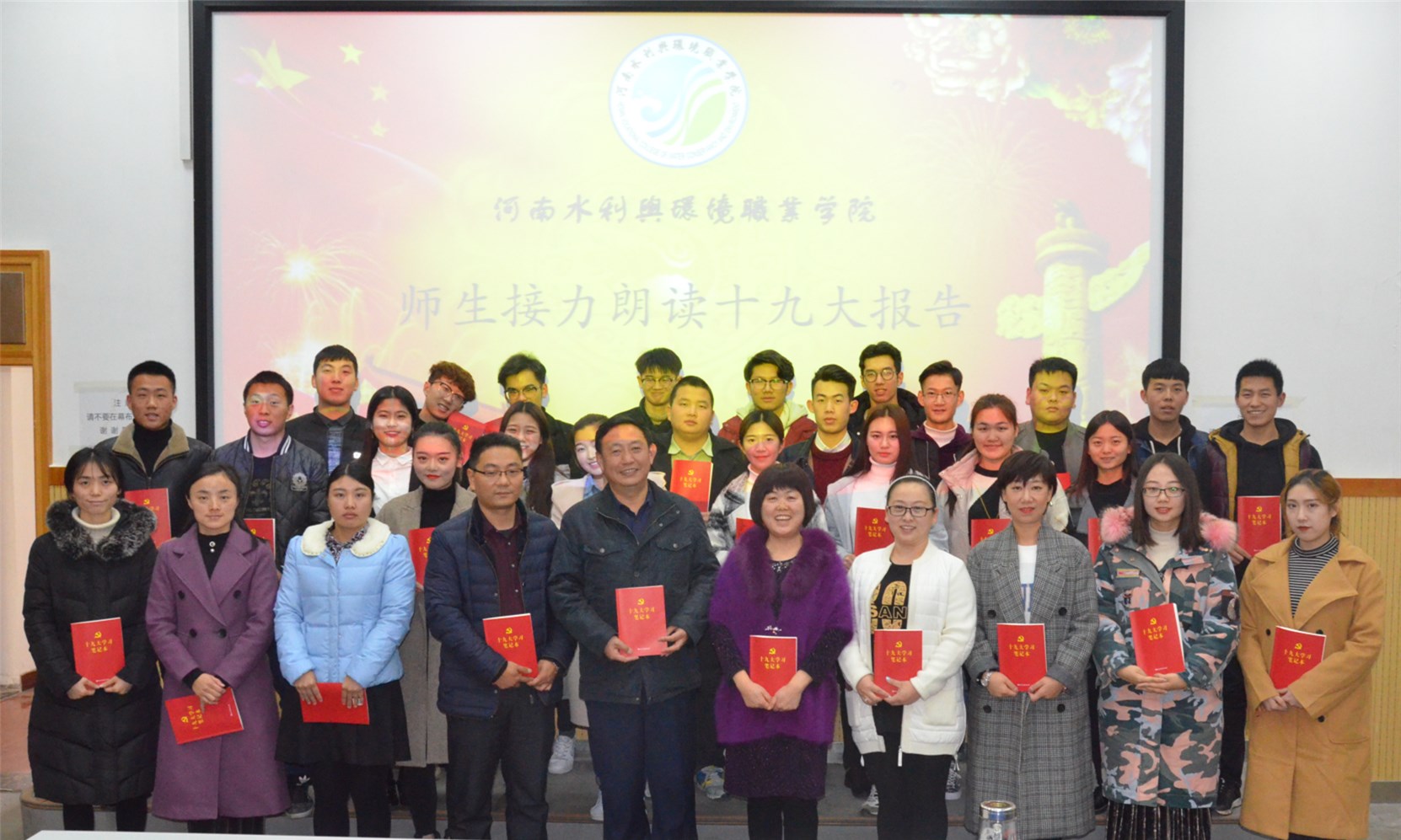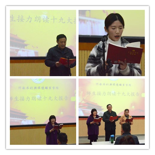 为深入贯彻落实党中央关于学习党的十九大精神的要求,根据院党委中心组扩大会议精神,12月1日下午,我院在北教二阶举行了“师生接力朗读十九大报告”活动。副院长蒋彦成、基础部副主任张卫国、思政课老师、班主任和辅导员代表及来自全院各系的学生代表共100余人参加本次活动。