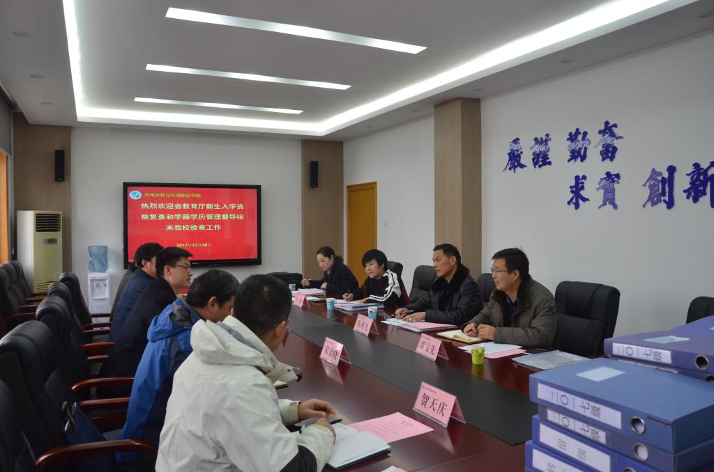2017年12月28日,由黄淮学院学生处长朱鸿飞、河南省司法警官学院学生处长李英、省教育厅学生处贾宝先、黄河水利职业技术学院教务处韩苏苏组成的河南省教育厅新生入学资格复查暨《普通高等学校学生管理规定》贯彻落实情况督导检查组莅临我院,对2017年新生入学资格复查和《普通高等学校学生管理规定》贯彻落实情况进行检查指导。院长郑志宏、副院长蒋彦成、学生处负责人及有关教师参加了汇报会。