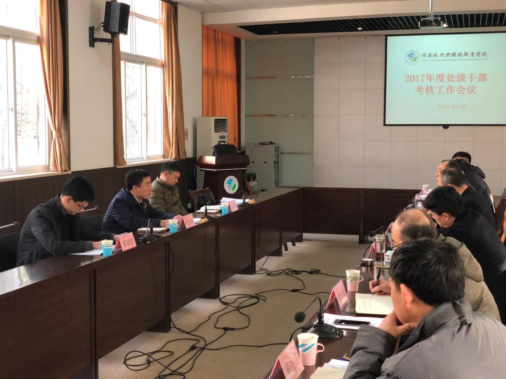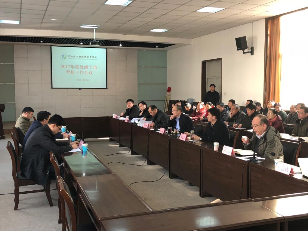 2月6日下午,我院召开2017年度院领导班子和厅管处级干部考核大会。由省水利厅人事处副处长樊浩明等一行3人组成的考核组在我院对2017年度领导班子和厅管处级干部进行了考核。我院全体校领导出席了会议,各处室、系部党政负责同志50余人参加了会议。会议由院党委书记王立正主持。