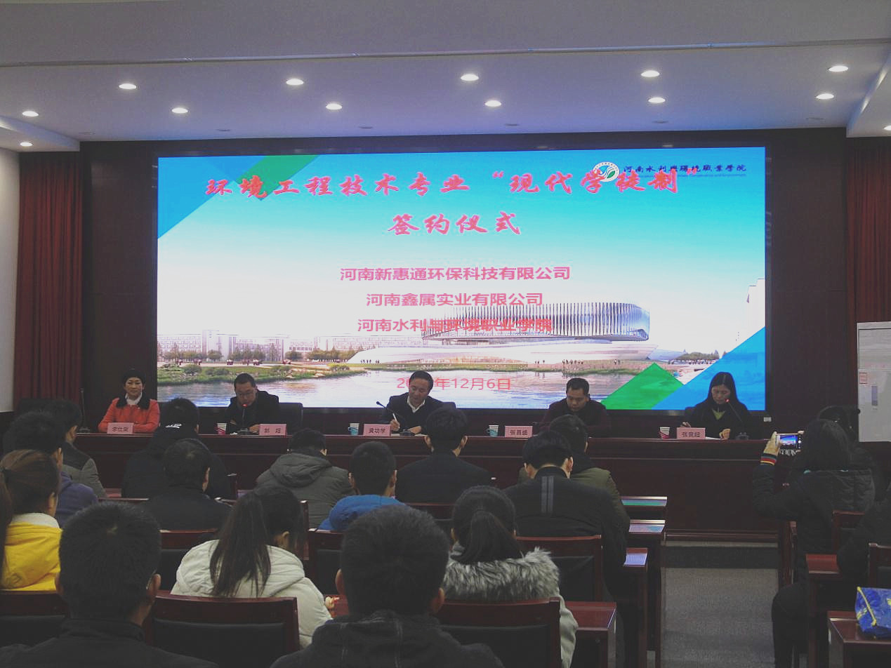 12月6日下午,我院在学术报告厅举行了环境工程技术专业“现代学徒制”签约仪式。副院长黄功学、相关部门负责人,河南新惠通环保科技有限公司、河南鑫属实业有限公司的3名企业代表参加仪式。仪式由教务处处长张竟超主持。
