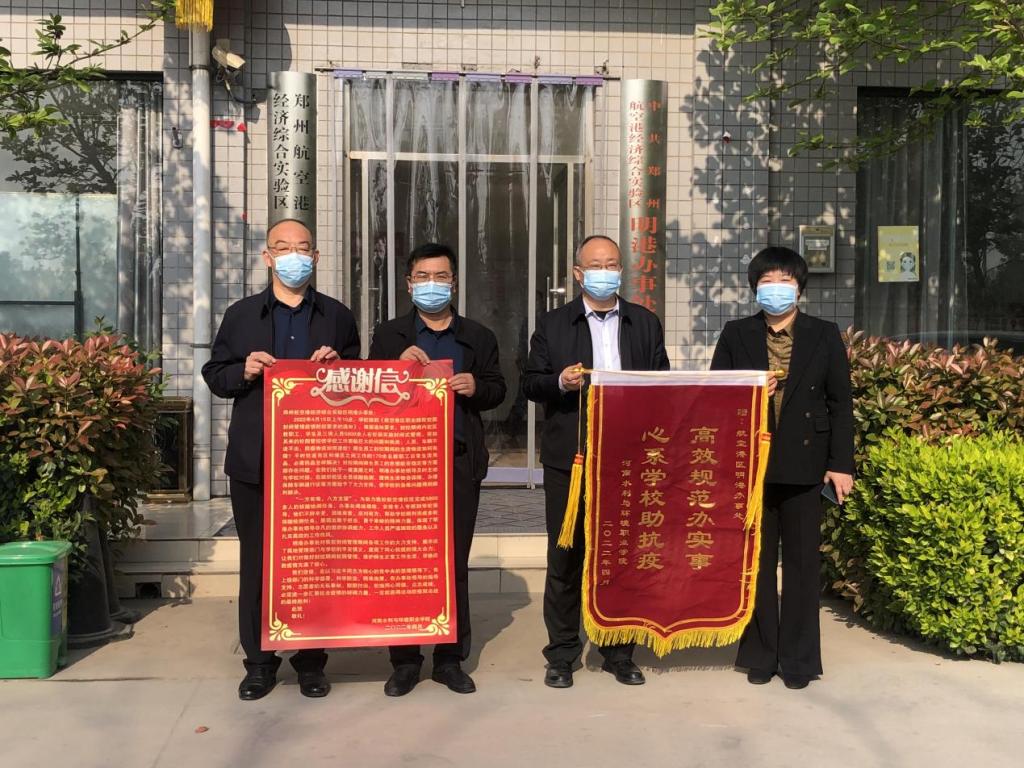 4月19日上午,校党委书记王立正、副校长惠大众带领党政办公室、航空港校区管委会、建管局负责人到郑州航空港区明港办事处走访慰问,对办事处给予学校的支持和关怀表示感谢,向办事处全体同志在封控期间的辛勤工作表示慰问,并赠送了感谢信和锦旗,捐赠了一批防疫物资,助力办事处疫情防控工作。明港办事处党工委书记郑艳霞、主任王继生、副主任李长营参加了活动,并对学校的慰问表示感谢,表示在大家的共同努力下,办事处疫情防控工作将会更加有效开展。