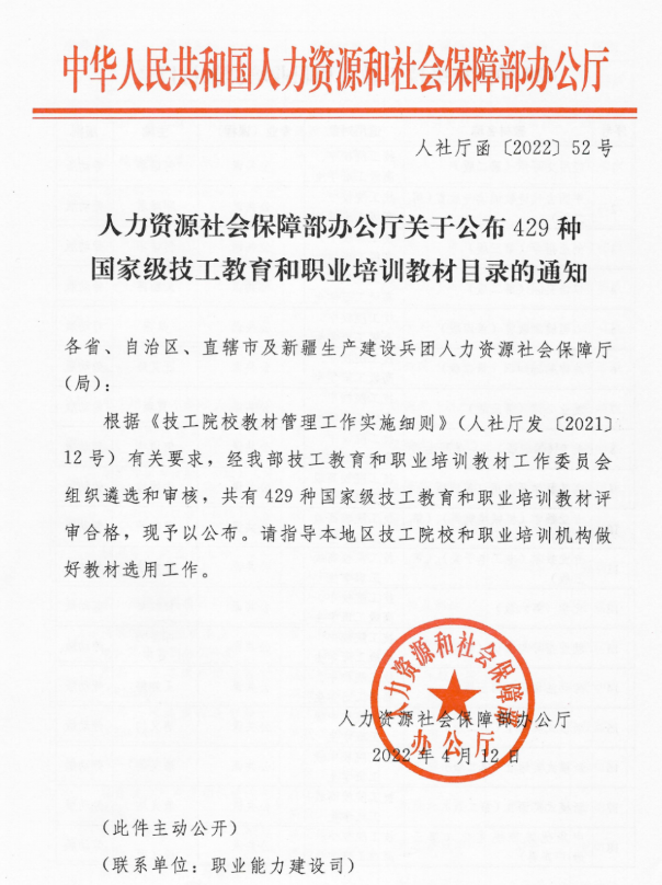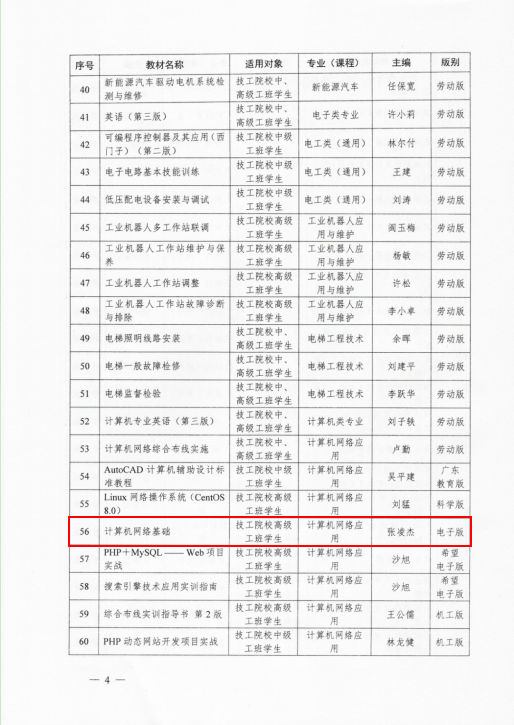 近日,人力资源和社会保障部办公厅下发《关于公布429种国家级技工教育和职业培训教材目录的通知》(人社厅函〔2022〕52号),由ylzzcom永利总站线路检测副校长张凌杰教授编写的教材《计算机网络基础》成功入选,这是该教材继入选2021年全国技工教育规划教材遴选书目后,再次入选国家级教材目录。