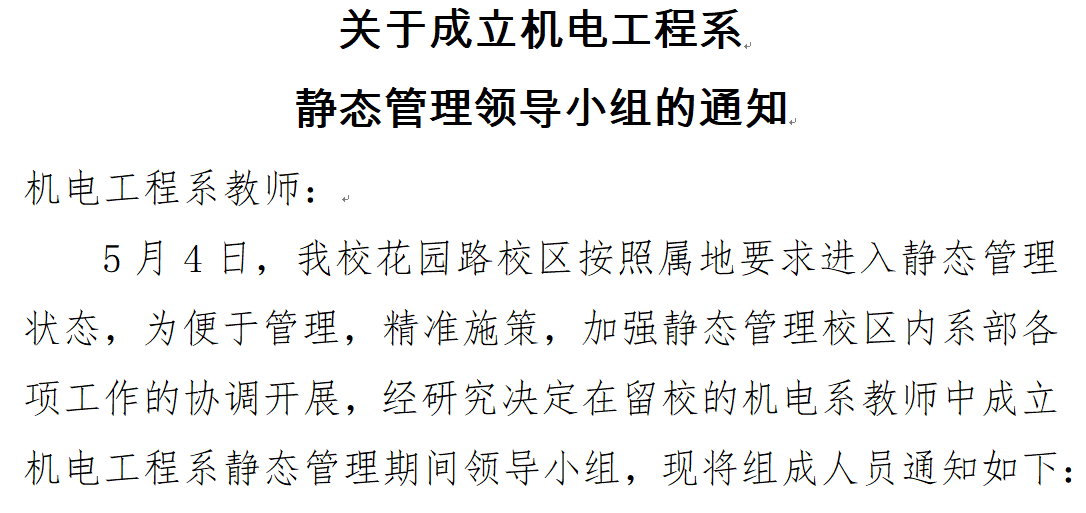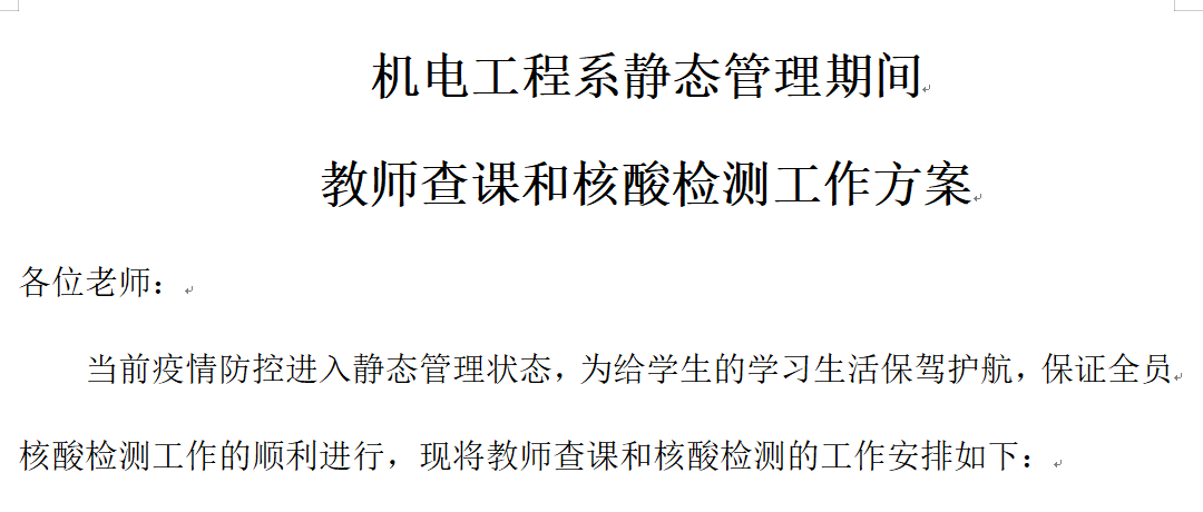 5月3日晚,在接到学校疫情防控工作紧急通知后,机电工程系立即召开紧急工作会议,周密安排部署各项工作,号召全系老师积极响应,快速行动,投入到疫情防控工作中去。5月4日,成立机电工程系静态管理领导小组,确保静态管理期间,教学及疫情防控等各项工作有序开展;优化教师巡课和师生核酸检测工作方案、疫情防控网格化管理方案,编排系疫情防控突击队值班表等,明确工作分工,加强团结协作。