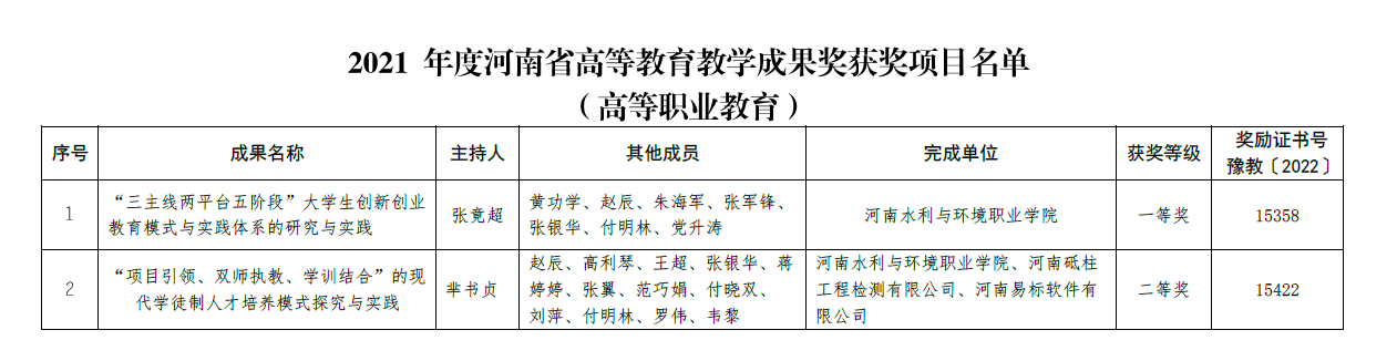 近日,河南省教育厅下发《关于公布2021年度河南省高等教育教学成果奖获奖项目的通知》,ylzzcom永利总站线路检测两项教学成果荣获“2021年度河南省高等教育教学成果奖”。其中,由张竟超教授主持完成的《“三主线两平台五阶段”大学生创新创业教育模式与实践体系的研究与实践》荣获一等奖;由芈书贞副教授主持完成的《“项目引领、双师执教、学训结合”的现代学徒制人才培养模式探究与实践》荣获二等奖。