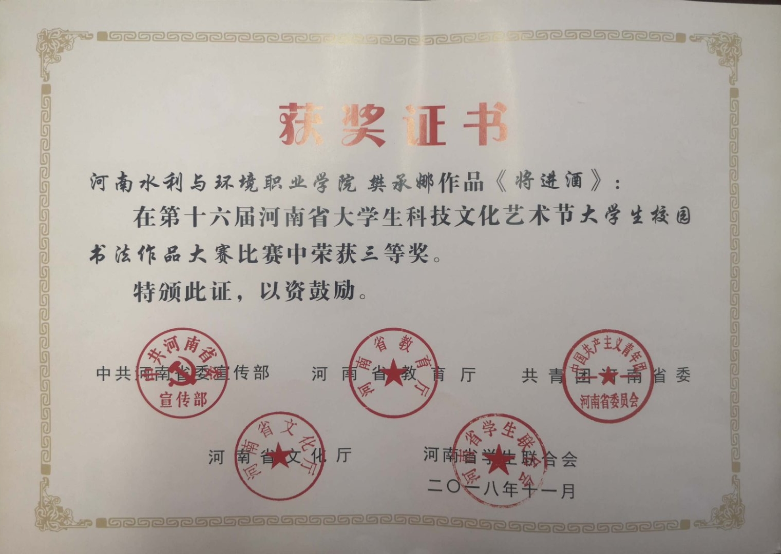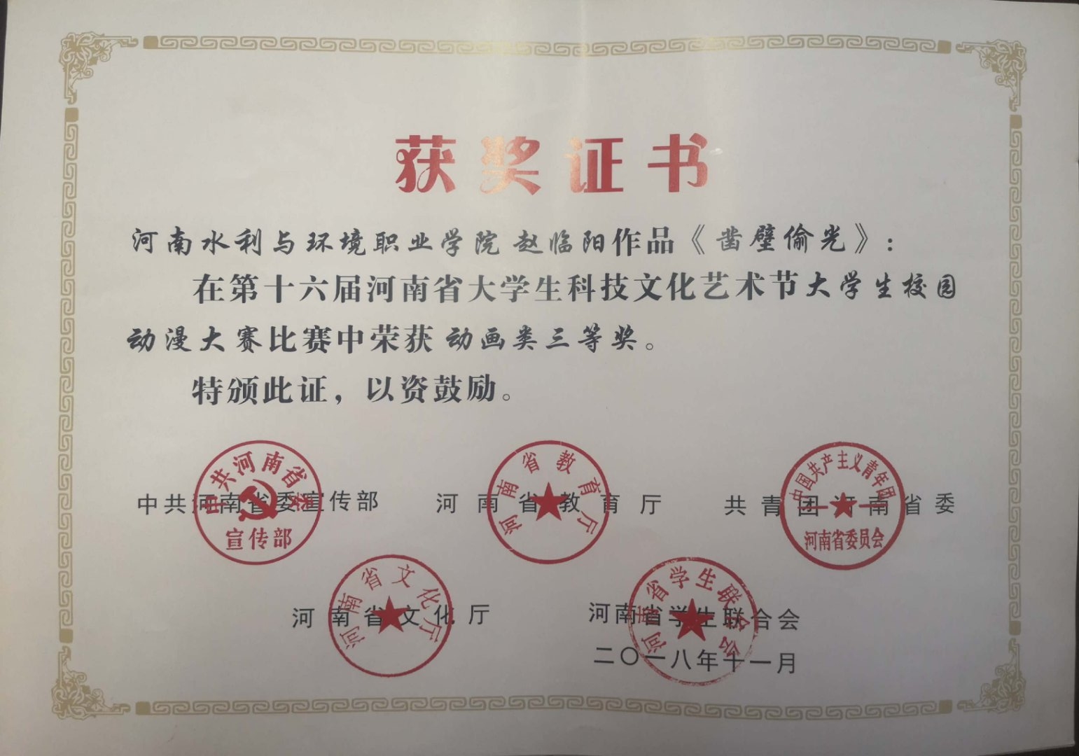 近日,由河南省委宣传部、河南省教育厅、共青团河南省委、河南省文化厅、河南省学生联合会共同举办的河南省第十六届大学生科技文化艺术节获奖名单揭晓,我院机电与信息工程系樊承娜、郑玉峰、赵临阳分别在“大学生校园书法作品大赛”、“大学生校园摄影作品大赛”和“大学生校园动漫大赛”中荣获三等奖。