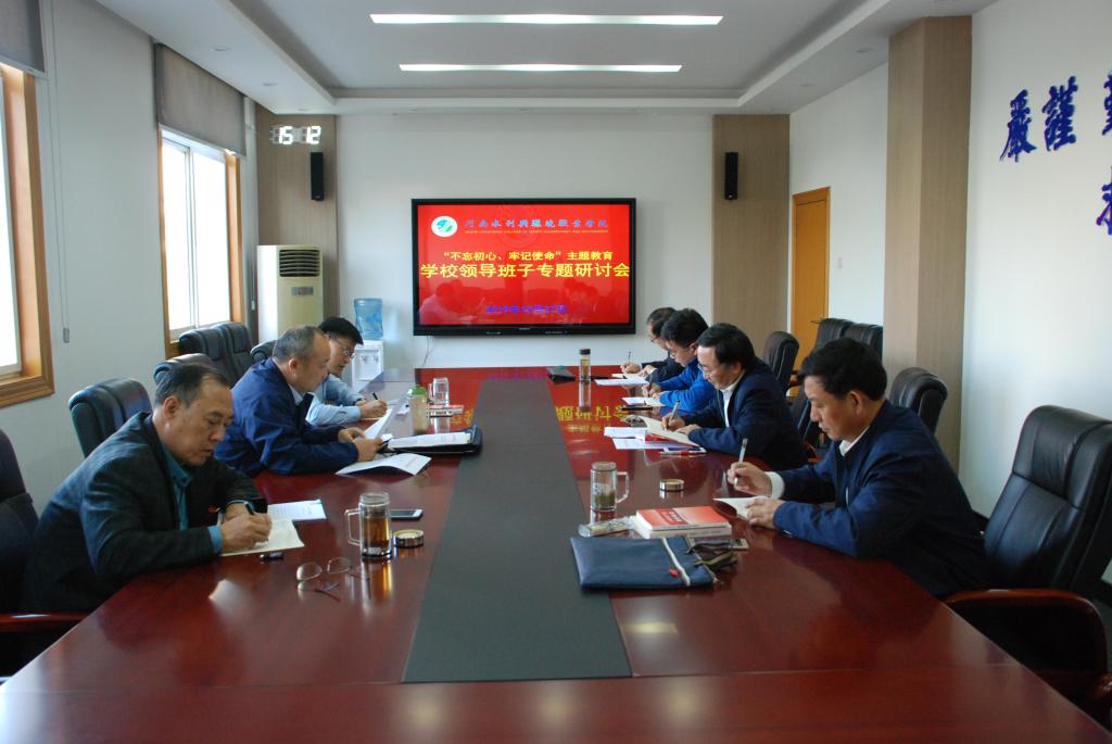 会议传达学习了省委高校工委、省水利厅下发的《关于认真学习贯彻习近平总书记考察调研河南时重要讲话精神的通知》、《关于转发中央主题教育领导小组<关于在“不忘初心、牢记使命”主题教育中加强爱国主义教育、弘扬爱国主义精神的通知>的通知》以及《关于在省水利厅“不忘初心、牢记使命”主题教育中对照党章党规找差距的工作方案》等文件精神。领导班子成员认真学习,积极讨论,结合自身学习,深刻认识与感悟上级文件精神和要求,并结合学校工作实际,对贯彻落实工作进行安排部署。