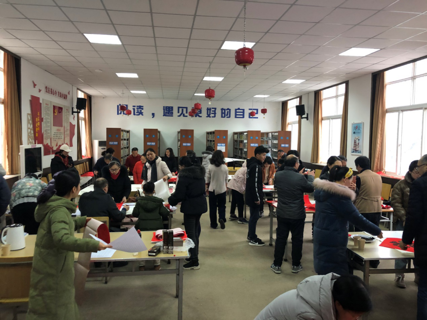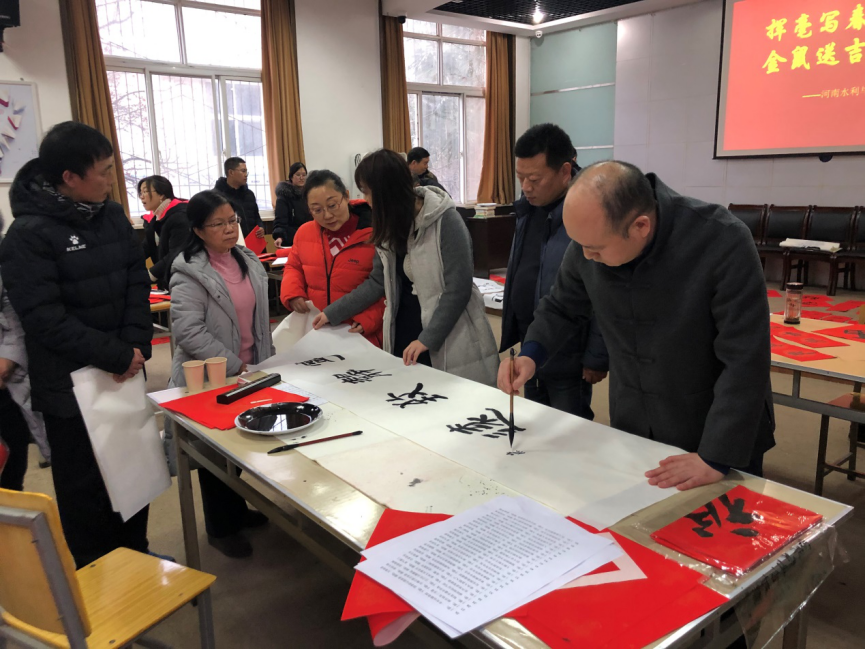 为响应省水利厅《关于开展2020年元旦春节期间“写春联 送祝福”进基层活动的通知》文件精神,深入贯彻习近平新时代中国特色社会主义思想,弘扬中华传统文化,1月7日下午,院工会邀请我院书法爱好者和河南水利书法协会7位同志,在学院图书馆一楼阅览室开展了迎新年为教职工书写春联活动,现场人来人往,洋溢着欢乐的气氛。活动历时四个多小时,书法家们挥毫泼墨,为教职工书写春联及字幅300余幅。