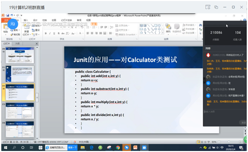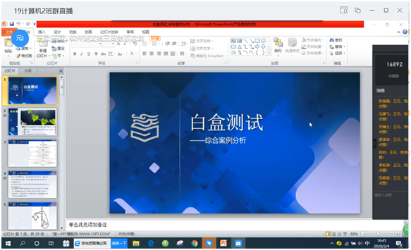 学生们上网络课,身边没有老师和同学,有点无助,他们渴望参与,渴望被关注。我会记住他们的名字,对于经常在互动面板与我互动的同学,记住他们的喜好。例如,19计算机2班有个同学叫周志恒,有一次我在分享我对于课外知识的兴趣这个话题时,他说他对英语感兴趣。今天上课时,我讲到白盒测试分析代码,学生们面对密密麻麻的代码难免会无感,同时我利用代码使用英语来描述这一特点,突然大声说:“周志恒,快来学英语!”,互动面板上立马出现许多互动。当我念代码时,学生们在对话框中实时应答,讲解最后,周志恒又和大家开玩笑,说“今晚9点欢迎收看我直播英语!”。