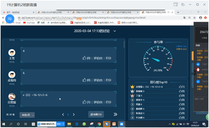 在课堂讲解进入白热化阶段,邀请学生进入职教云参与课堂讨论。我鼓励他们“抢占第一排沙发”,“坐头等舱”,最先回答正确的同学有奖,学生们参与度很高。