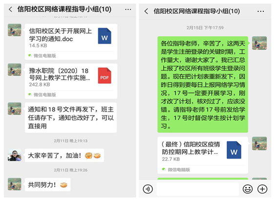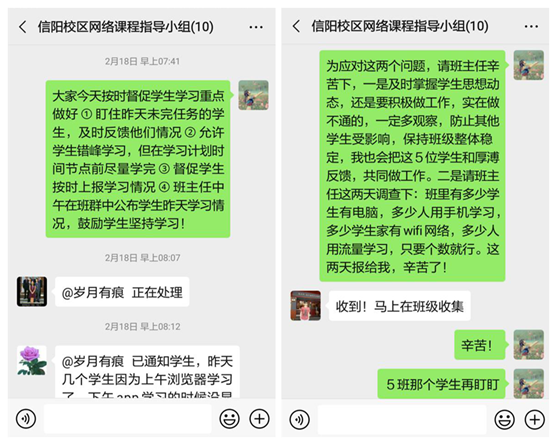 为了顺利完成网络教学任务,信阳校区成立了由教学负责人、指导教师和班主任组成的第一期网络课程工作小组,通过开会讨论、预估问题、学生调查等方式,统筹安排,严密组织,指导教师和班主任相互配合,紧盯工作落实。