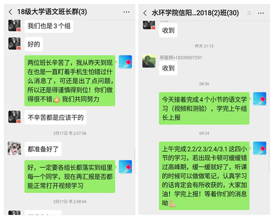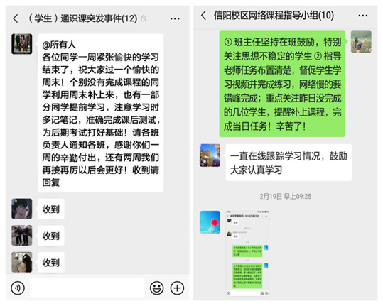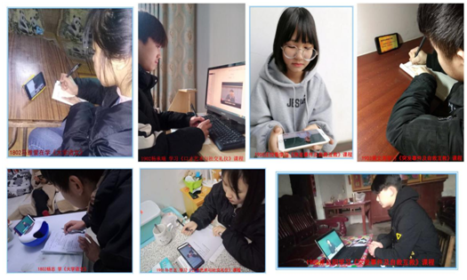 万事开头难,课程一开始,还是出现了不少棘手问题,个别学生联系不上、一些学生学习登录不顺利,学习过程中信号不好、出现卡断现象……,部分学生出现了焦急情绪。针对这些问题,信阳校区积极应对,教学负责人温晓蕾、指导教师吴锐、熊道松、马丽亚和全体班主任全程在线,坚守学习群,只要有学生出现问题,第一时间与学生沟通,不厌其烦地逐个指导。学生虽然见不到老师,但却能从老师温暖的话语中感受到关怀与帮助,仿佛老师就在身边。渐渐地学生熟悉了学习操作方法,错峰学习,静心完成每天的学习任务。