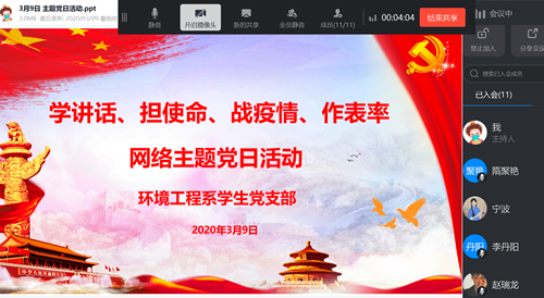 3月9日下午,环境工程系学生党支部采用钉钉直播形式组织全体党员开展“学讲话、担使命、战疫情、作表率”主题党日活动。活动由党支部书记董晓明主持。