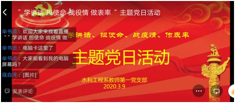 院党委《关于在疫情防控中开展“学讲话、担使命、战疫情、作表率”主题党日活动的通知》下发后,水利工程系充分利用线上平台,以支部集中学习及小组讨论的形式组织党员开展了“学讲话、担使命、战疫情、作表率”主题党日活动。各支部组织党员在线收看了由教育部社会科学司、人民网联合举办的“全国大学生同上一堂课疫情防控思政大课”;学习了习近平关于疫情战役的系列讲话、河南省委直属机关工委《关于在疫情防控中开展主题党日活动的通知》和院党委《关于在疫情防控中开展“学讲话、担使命、战疫情、作表率” 主题党日活动的通知》、《ylzzcom永利总站线路检测开展“把灾难当教材 与祖国共成长”主题教育活动实施方案》等文件精神;开展学习讨论,就如何在疫情情况下,发挥党支部战斗堡垒作用和党员的先锋模范作用,如何立足岗位,开展好教学、疫情防控等工作交流心得、畅谈体会。