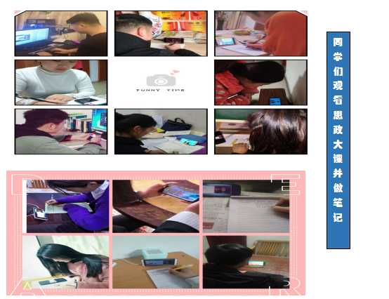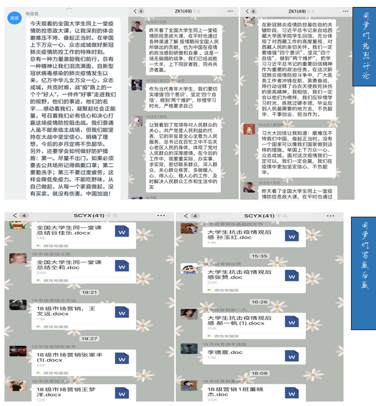 年轻老师贺蓓蓓说到:“经过这次疫情,我们更加认识到自己的国家、自己的民族始终是我们最强大的背景和依靠。”李中飞老师说到:“疫情来了,我深刻认识到白衣天绝不是空洞的赞美,相比那些逆行者,希望我们这些薪火相传者不能仅仅成为人们口中的蜡烛、春蚕。”班主任刘君老师说到:“我们一定要胸有大志、心有大我、“肩有大任、行有大德。”我们坚信这场疫情防控战终将成为中国胜利的典范,写进中华民族的历史教科书。