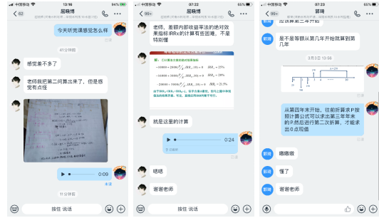 实时了解学生线上学习情况,全天候密切留意学生消息,发现问题,及时解决。面对学生提出的线上教学反馈,虚心听取,努力改正,确保线上教学质量“不打折”。