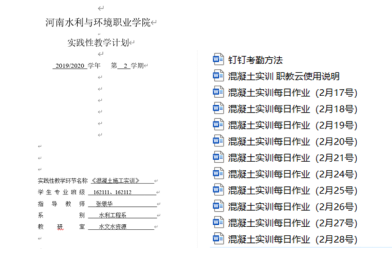 在接到网络授课通知后,为了能顺利开展网上教学工作,张银华老师早早就开始投入到教学工作的思考和新软件的学习中来。张银华老师承担的线上教学课程是混凝土工程实训,为了圆满的完成教学任务,让学生有所学,有所收获,张银华老师做足了充分准备。根据实际教学时间安排,提前制定教学计划,为了保证学生在家中能够养成良好的学习习惯,督促学生自觉学习,有效完成学习任务,在教学开始前一周在职教云上布置了学习须知和每日作业。