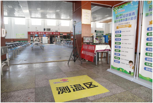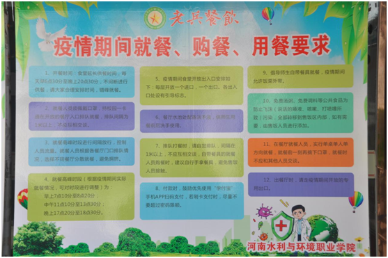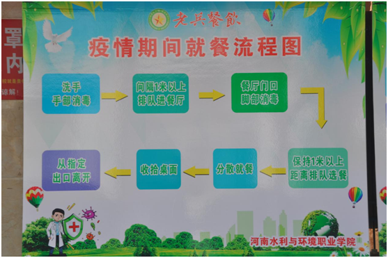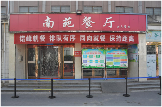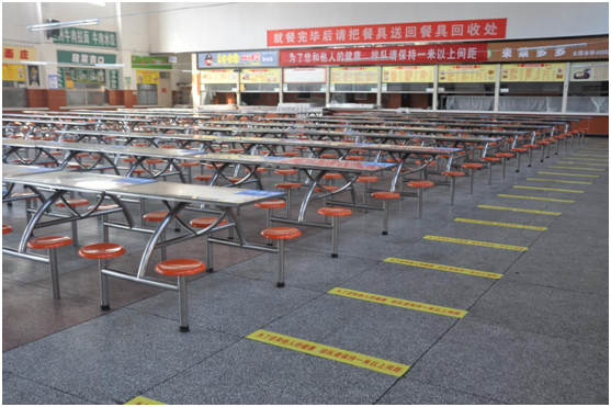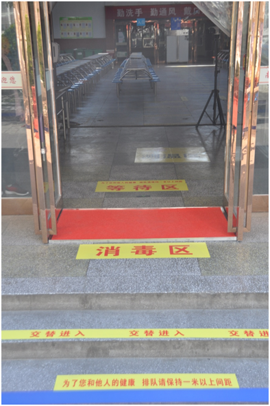 食堂入口设有错峰排队隔离带,消毒区,防控宣传展板