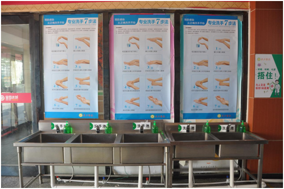 食堂门口加装洗手池,配备感应水龙头、洗手液,粘贴洗手7步法
