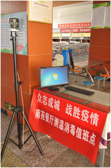 传统手持测温仪测量体温速度慢,有误差,并且在使用时工作人员与师生距离较近存在病毒传播风险。为此,学校后勤服务中心配置了红外热成像仪,这种仪器具备测温速度快、精度高、可视化监测、自动报警等优点,只要人员进入摄像头监控范围内,就可以检测到体温,尽量减少测温给同学们带来的不便,可有效降低人员聚集。