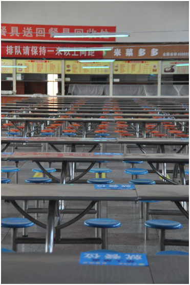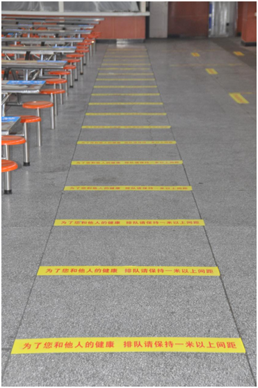 食堂门口设有防护栏和引导线,目的是引导师生错开就餐高峰期排队就餐,选餐排队间隔1米以上距离