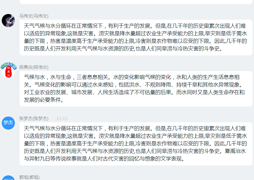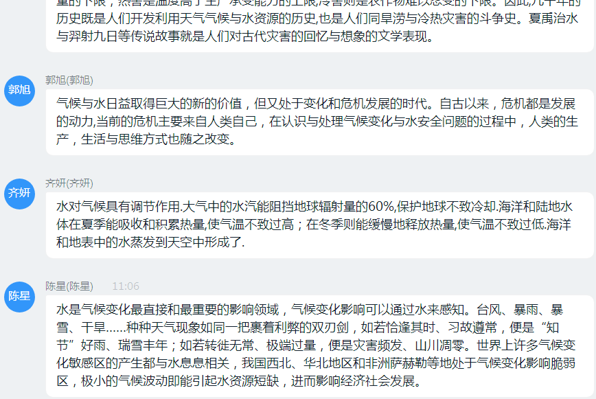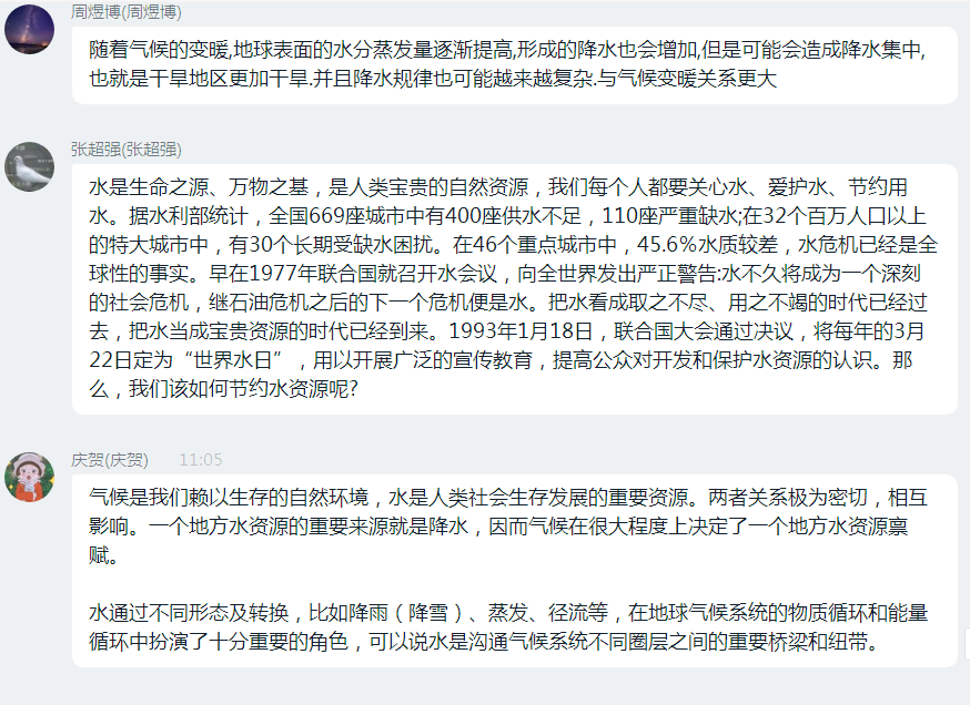 在讨论关于水与气候关系中,18水利造价班段昊焱同学说:气候与水,水与生命,三者息息相关。水的变化影响气候的变化,水和人类的生产生活息息相关。气候变化的影响可以通过水来感知,包括洪水、不规则降雨、持续干旱和其他水异常现象。对工业农业的发展、城市发展、人民生活造成了不可估量的后果。而水同时又是人类生命存在和发展的必要条件。