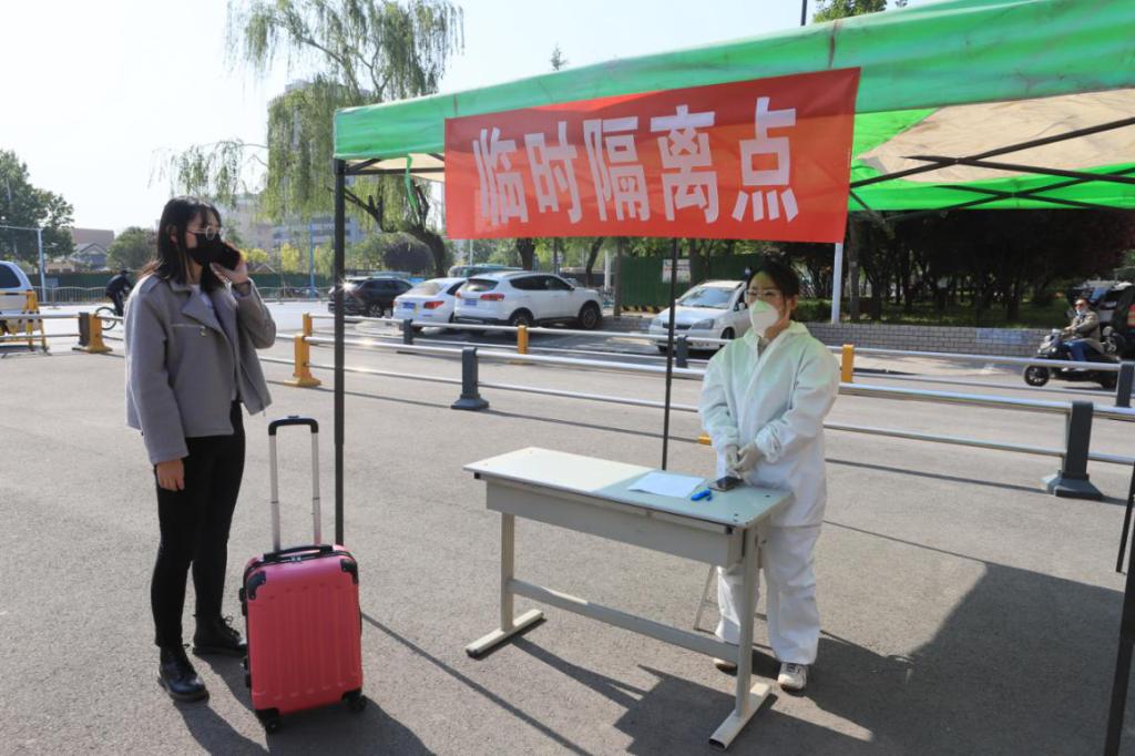 宿舍楼前,学生依次进入宿舍,其中出现一名体温异常学生,随后二次复检体温正常。