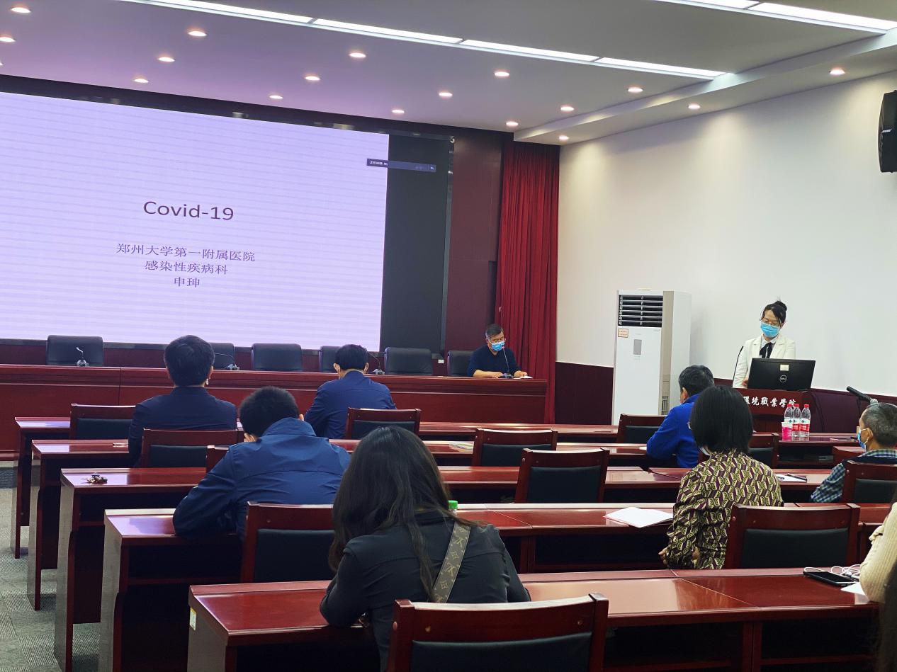 为切实提高校园疫情防控能力,普及新冠肺炎相关防护知识,4月30日上午,我院后勤服务中心特邀赴武汉抗疫英雄郑州大学第一附属医院感染科申坤医生,为我院全体教职工进行新冠肺炎防控知识讲座。本次讲座采用现场参会和网上直播相结合的方式进行,副院长蒋彦成及后勤、学管等人员现场参会。