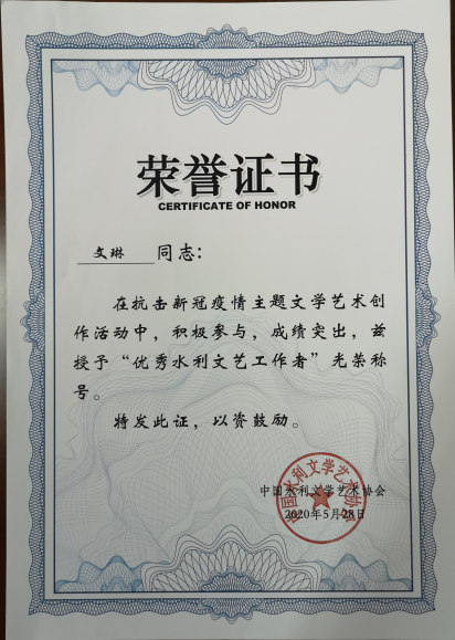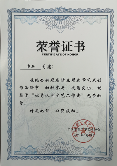 在中国水利文学艺术协会组织开展的水利系统抗击新冠疫情主题文学艺术创作活动中,鲁兵、文琳、李中飞三名同志分获“优秀水利文艺工作者”称号,此项活动旨在进一步发挥典型的激励、示范、引领作用,引导广大水利文艺工作者不忘初心、牢记使命,推进水利系统精神文明建设和水利文化艺术繁荣发展。