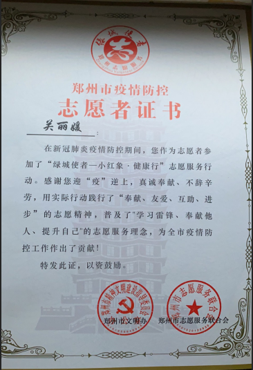 关丽媛同志在新冠肺炎疫情防控期间积极参加郑州市“绿城使者-小红象 健康行”志愿服务行动,到社区开展宣传教育、值守服务等工作,用实际行动践行了“奉献、友爱、互助、进步”的志愿精神。