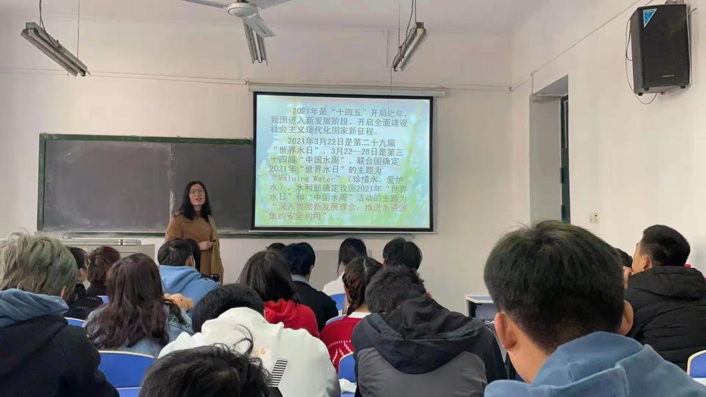 一、开展课堂宣讲。教师隋聚艳、李丹丹结合正在讲授的课程《水资源保护》和《水污染控制工程》的教学内容,分别向2019级生态班和2020级环工班共计156名学生详细讲解了树立水资源危机意识的重要性、防止水源污染的具体措施以及保障水体自身持续发展等水资源知识,加深了学生对水资源集约安全利用的认识。