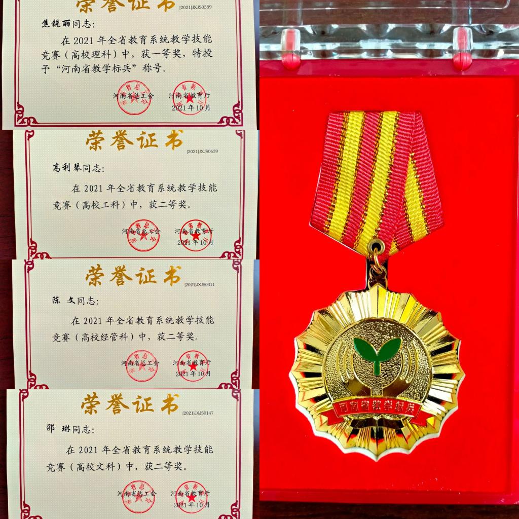 由河南省总工会、河南省教育厅组织的河南省教育系统2021年度教学技能竞赛于2021年6月至10月举行。ylzzcom永利总站线路检测教师焦锐丽荣获一等奖,被授予“河南省教学标兵”称号并颁发奖章,高利琴、陈文和邵琳分别荣获二等奖。