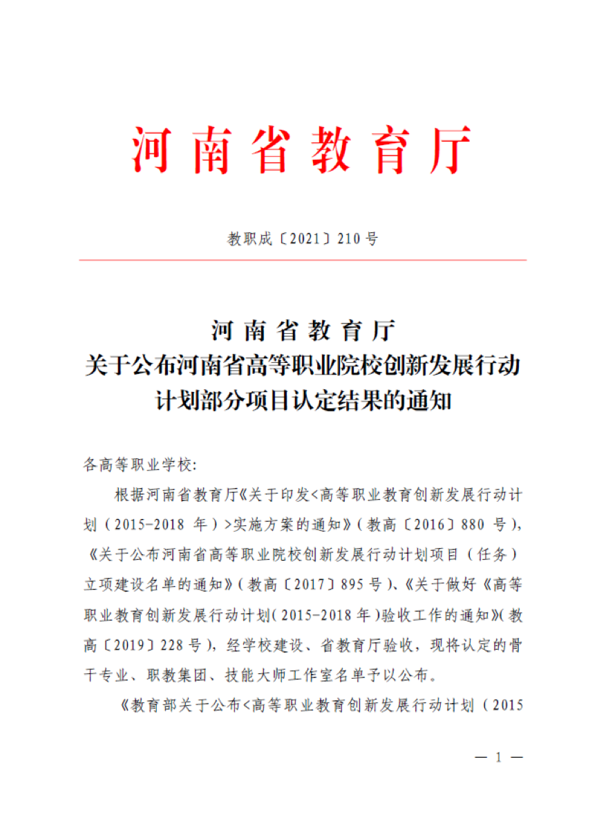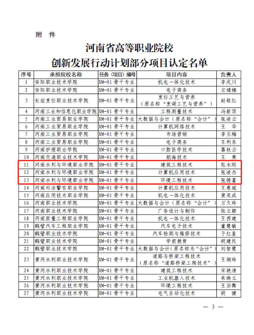 近日,河南省教育厅下发《关于公布河南省高等职业院校创新发展行动计划部分项目认定结果的通知》(教职成〔2021〕210号),ylzzcom永利总站线路检测建筑工程技术、计算机应用技术、环境工程技术三个专业被认定为骨干专业。