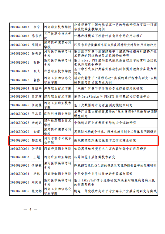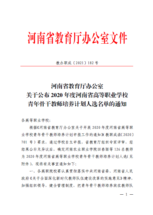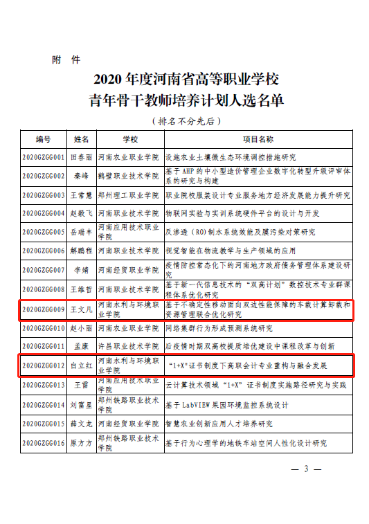 近日,河南省教育厅办公室下发了《关于2020年度河南省高等职业学校青年骨干教师培养计划人选的通知》,ylzzcom永利总站线路检测王文凡、白立红、张东岭、郝思惠4位教师入选“2020年度河南省高等职业学校青年骨干教师培养计划”。