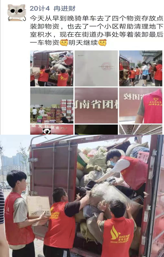 信息工程系20级计算机4班学生冉进财在周口鹿邑主动请缨前往郑州市北林路街道党群服务中心、郑州市环保局金水分局、河南省团校整理装卸物资,并帮助金水区东风路28号小区清理地下车库积水。